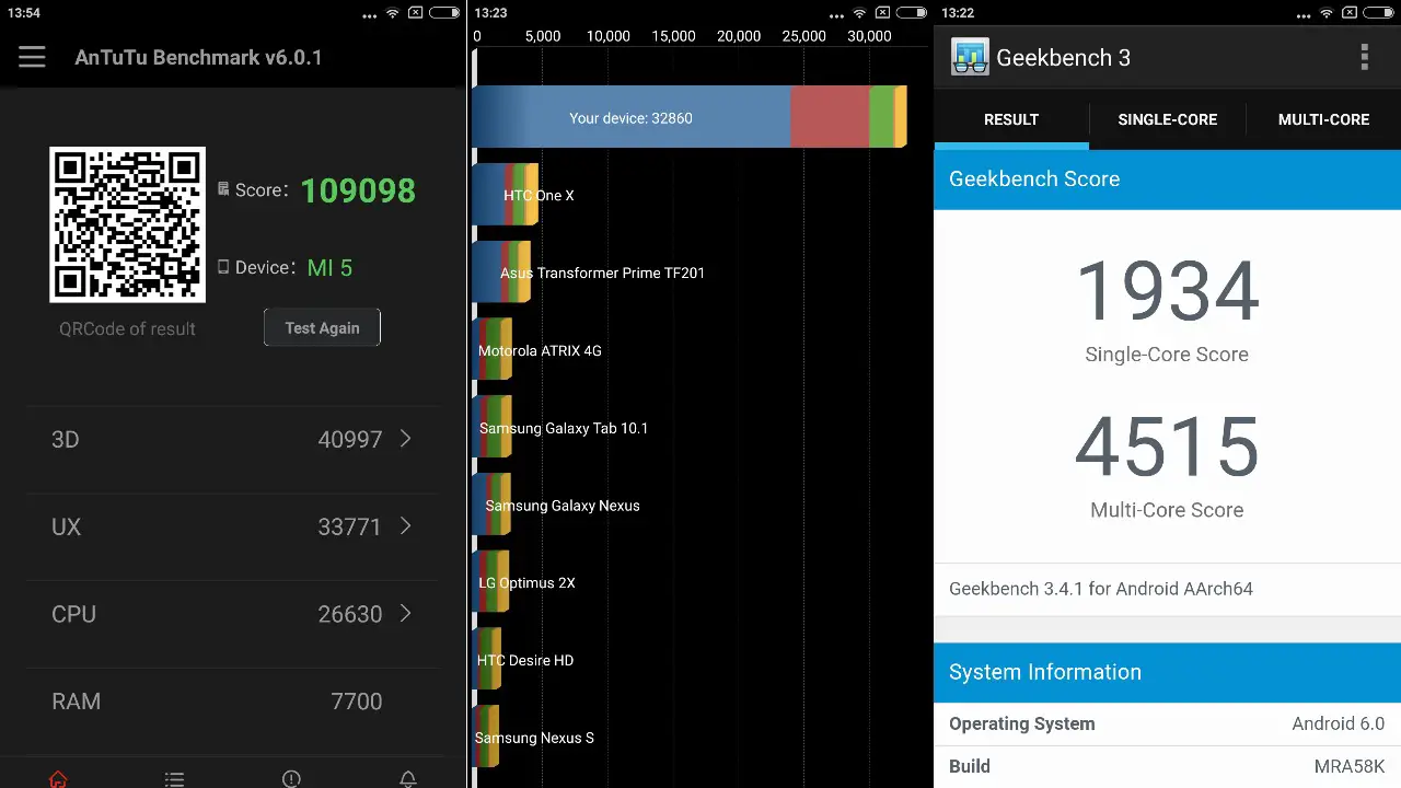 The benchmark scores of the Xiaomi Mi 5 are: