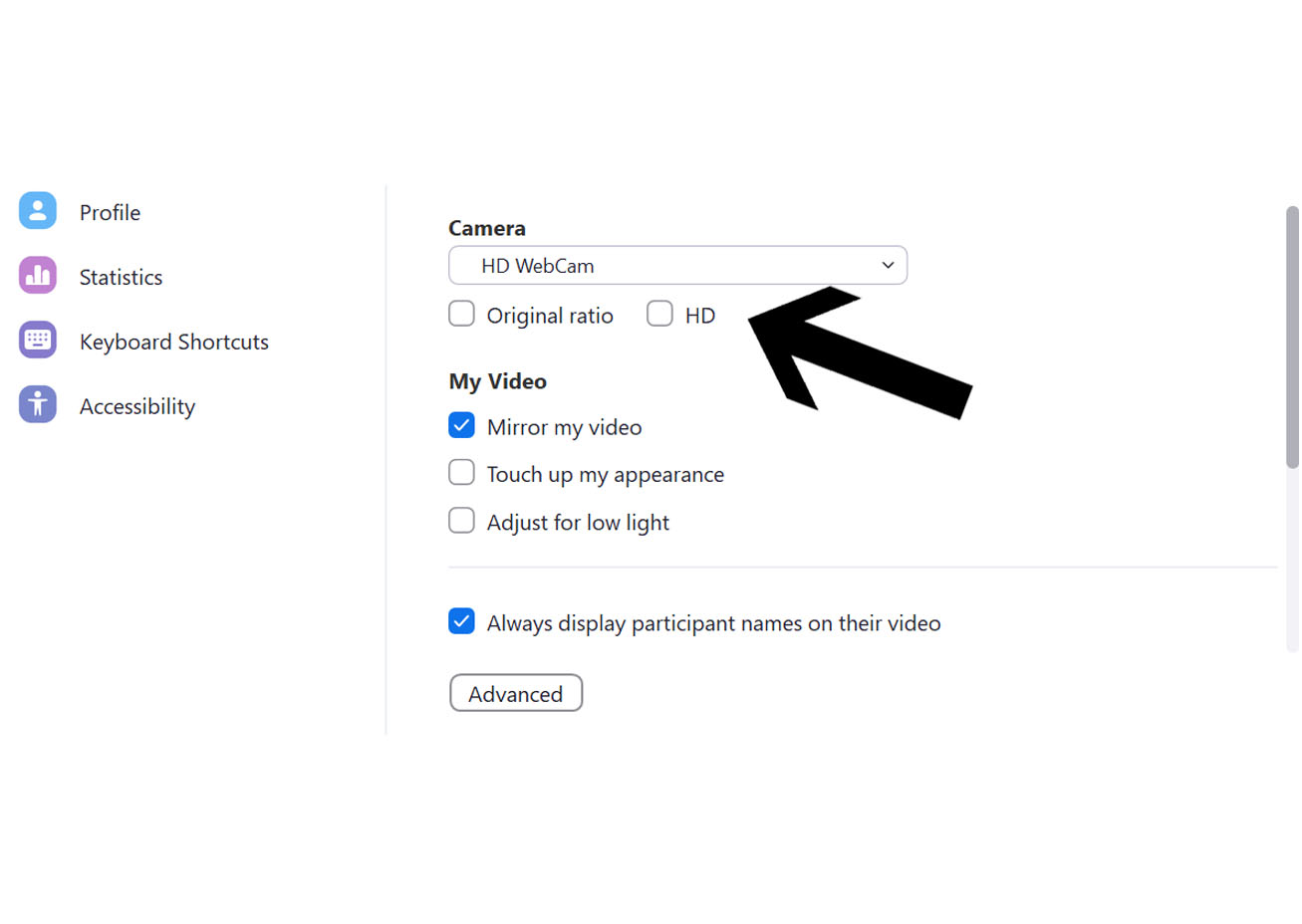 In case it’s your turn to present for the meeting, and there’s no option left except to turn the camera ON. If possible, make sure to disable the HD Webcam under the Zoom settings, in order to improve the overall experience.