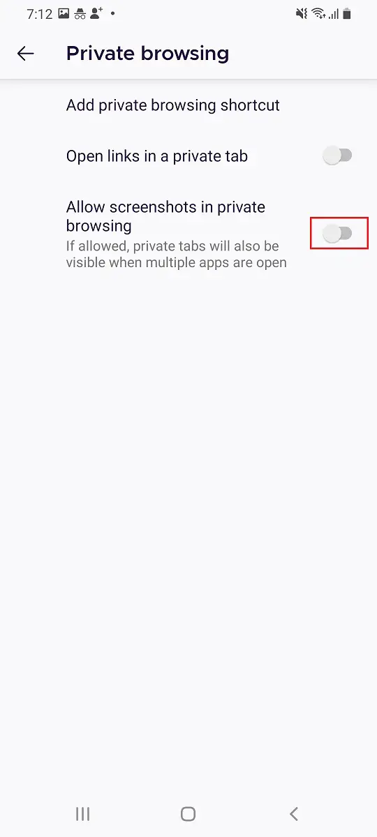 4. On the next page, switch on the toggle next to “Allow screenshots in private browsing”.
