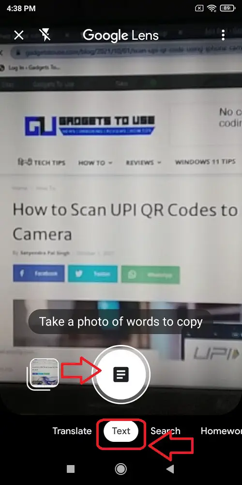 - Tap on the ‘Capture’ button to allow the Lens app to identify text.