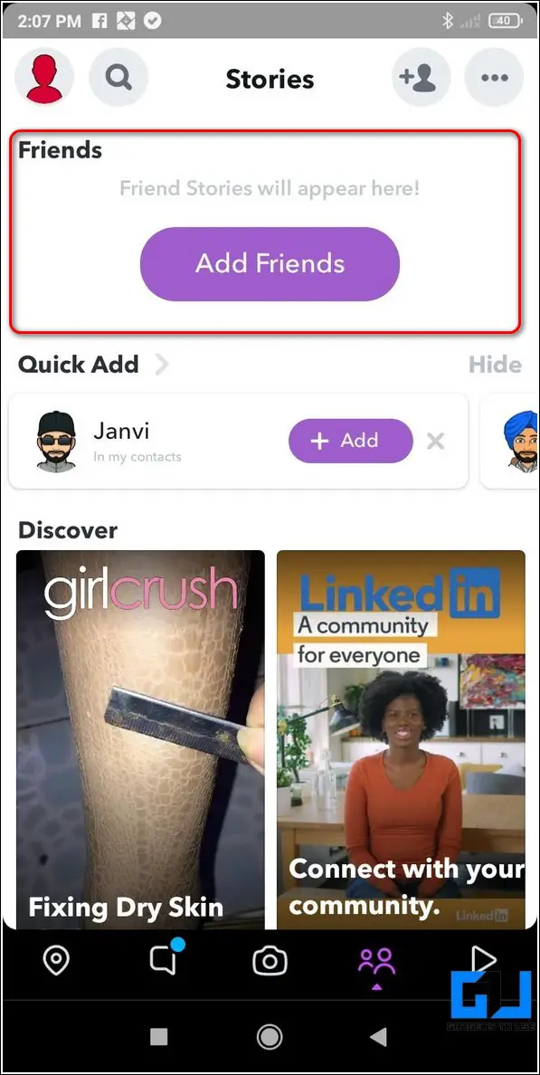 - Find and locate the Friends section at the top. All new stories from your Snapchat friends will appear here.