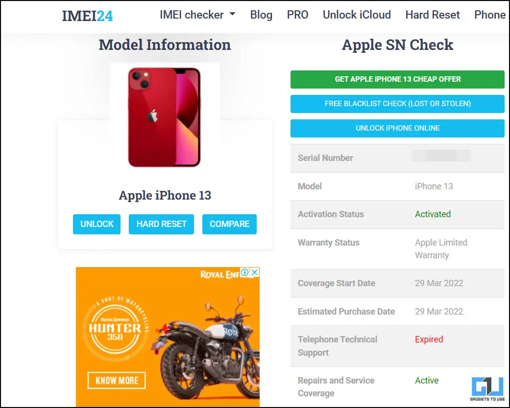 The SnDeep website also works like IMEI24, but it is limited to only Apple and Samsung, but it can also fetch the manufacturing date of your phone. Along with this you can know and update the lost or stolen status of the phone, there’s also a telegram bot of this website.