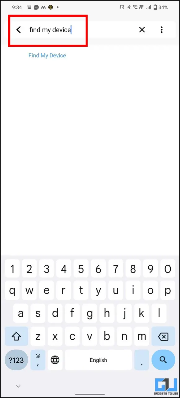1. Open the Settings app on their phone and type ‘Find my device‘ in the search bar.