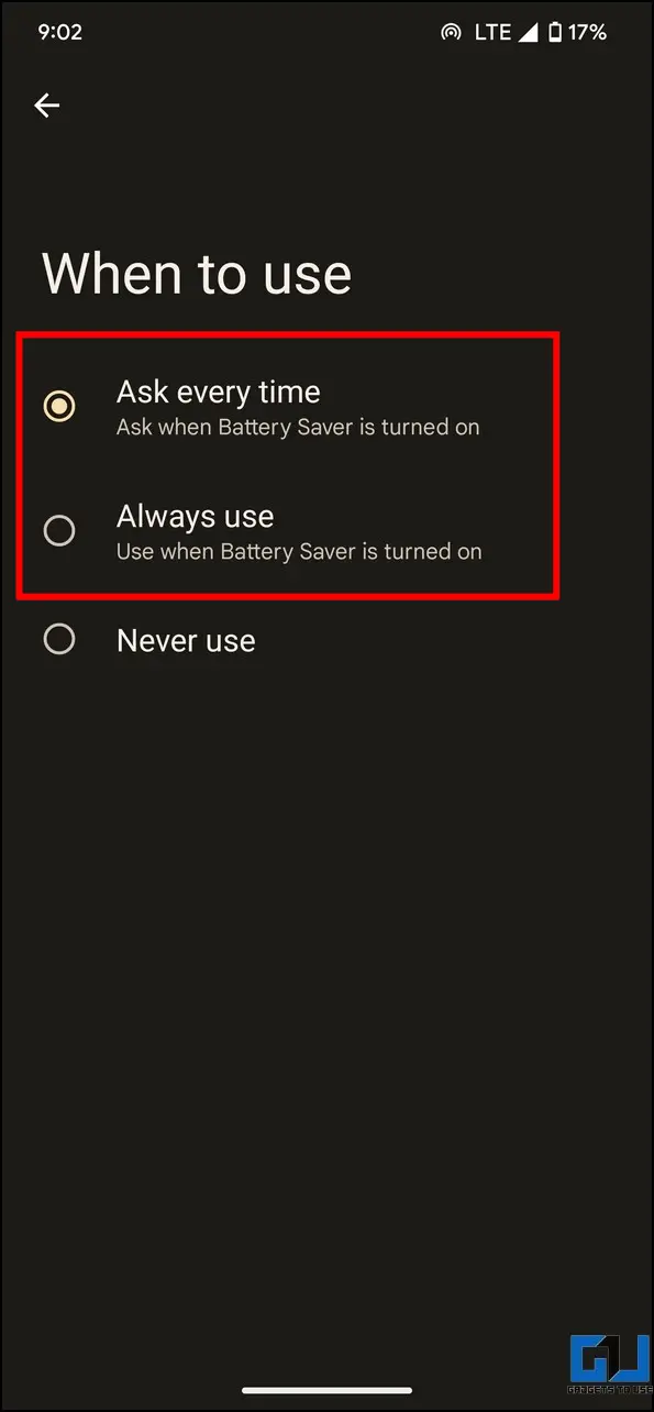 3. Tap on the ‘ When to Use‘ button. On the next page, you will get two options, ‘Ask Every Time‘ and ‘Always Use,’ through which you can enable extreme battery saver mode via a notification prompt or automate it with battery saver mode, respectively.
