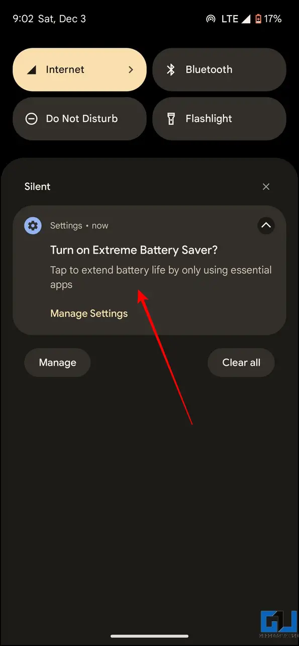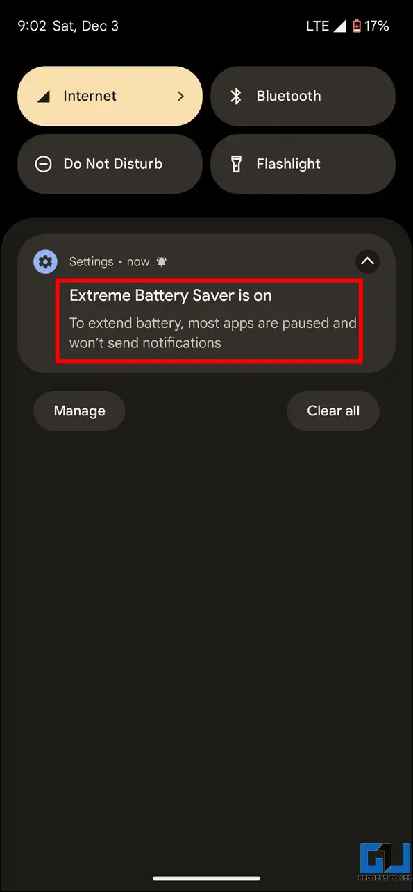 5. If you’ve picked the ‘Ask Every Time‘ option before, you will instantly get a notification prompt for the Extreme Battery Saver mode to enable it. Alternatively, if you’ve picked the ‘Always Use‘ option, extreme battery saver mode will activate automatically with its corresponding notification in the notification center.