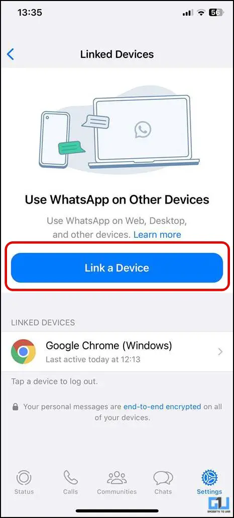 - iOS – Launch WhatsApp on your iPhone, switch to the Settings tab, and tap on Linked Devices.