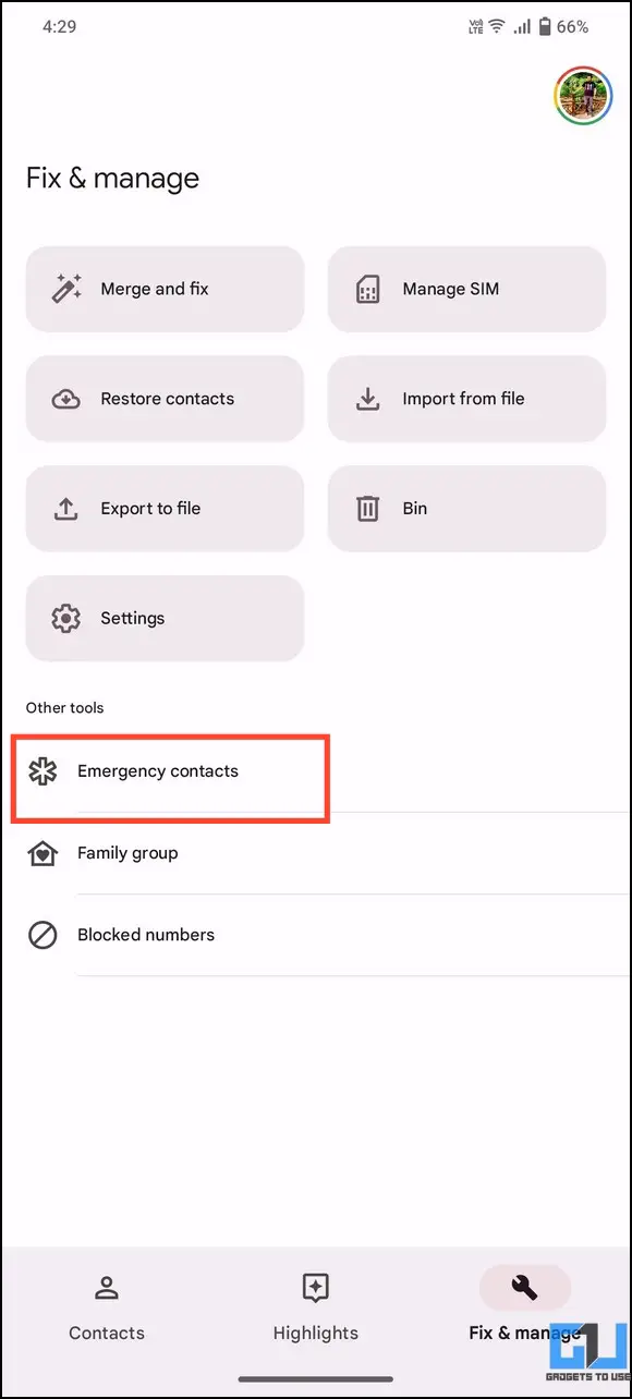 2. Next, open Contacts and switch to the Fix and Manage tab. Tap on Emergency Contacts.
