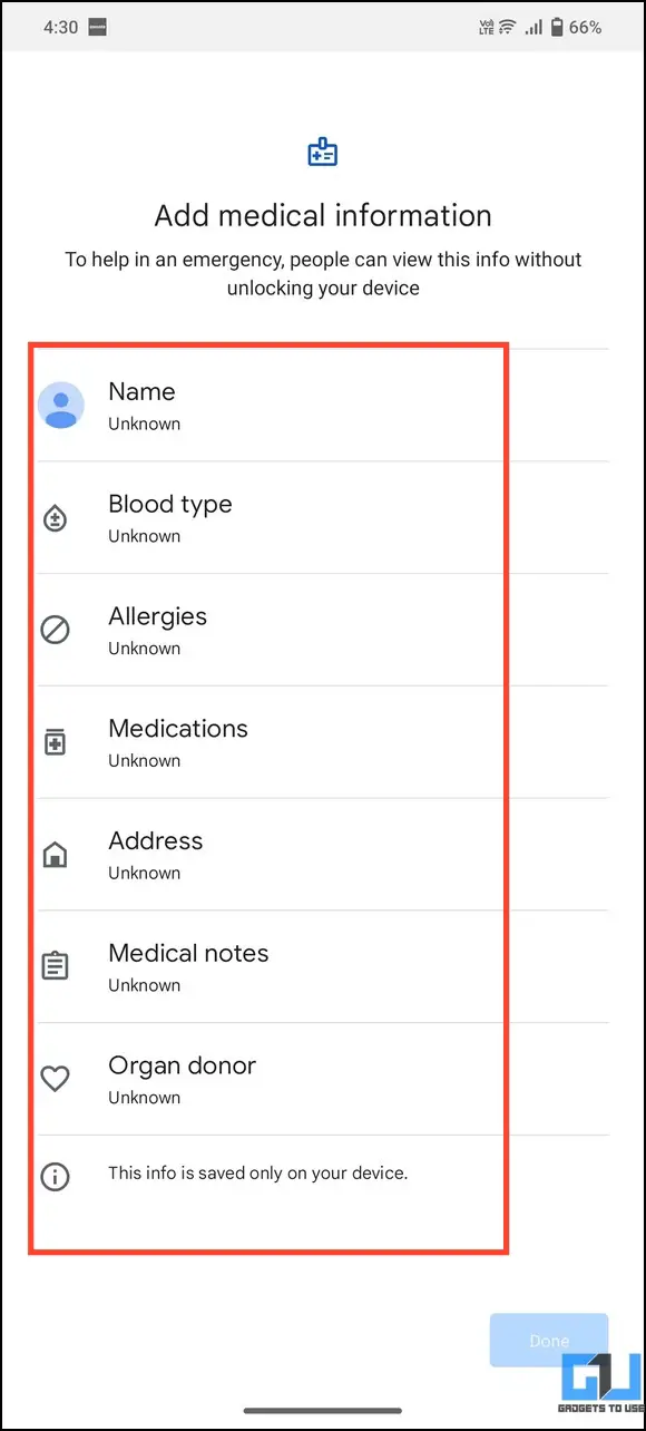5. Add your necessary medical information, such as Name, Blood Type, Allergies, etc., and tap Done to save changes. That’s it! You’ve successfully added emergency info to your Google account on Android using the Contacts app.