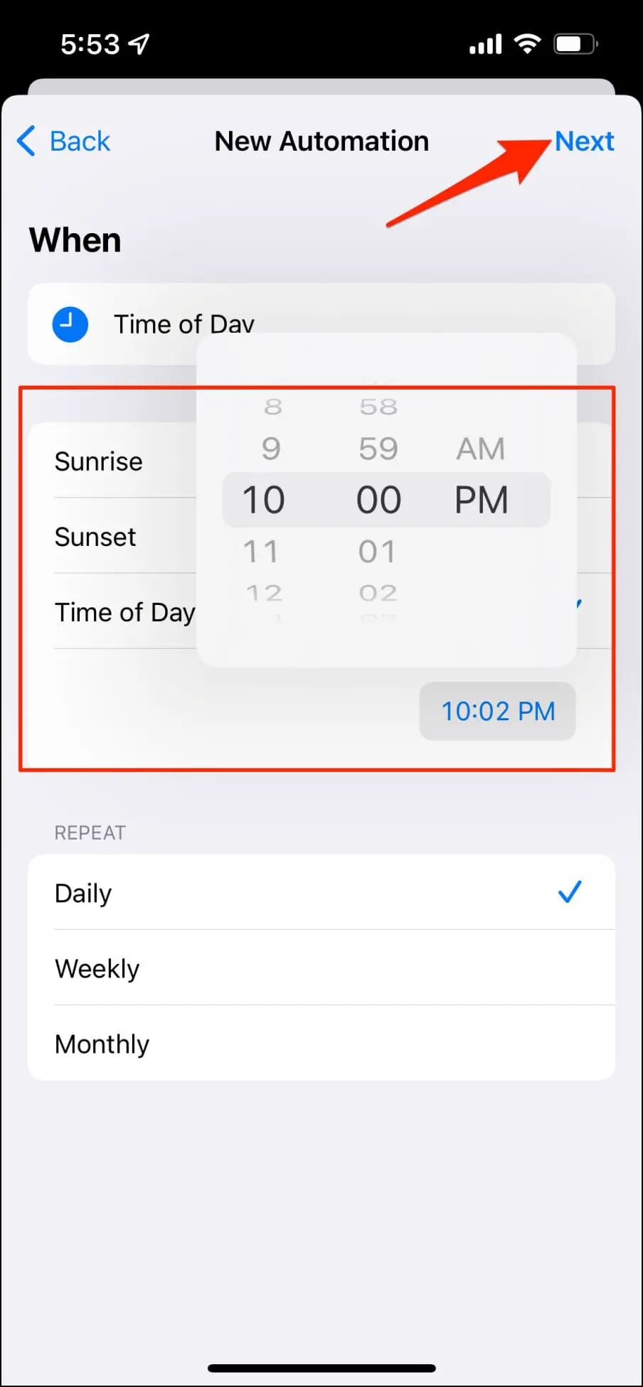 5. Specify the time or choose Sunset, followed by Daily under repeat. Tap Next.