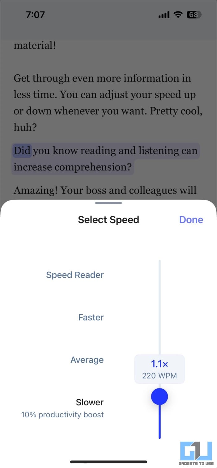 - It allows you to manually select a text and let your iPhone read it aloud for you, as shown below.