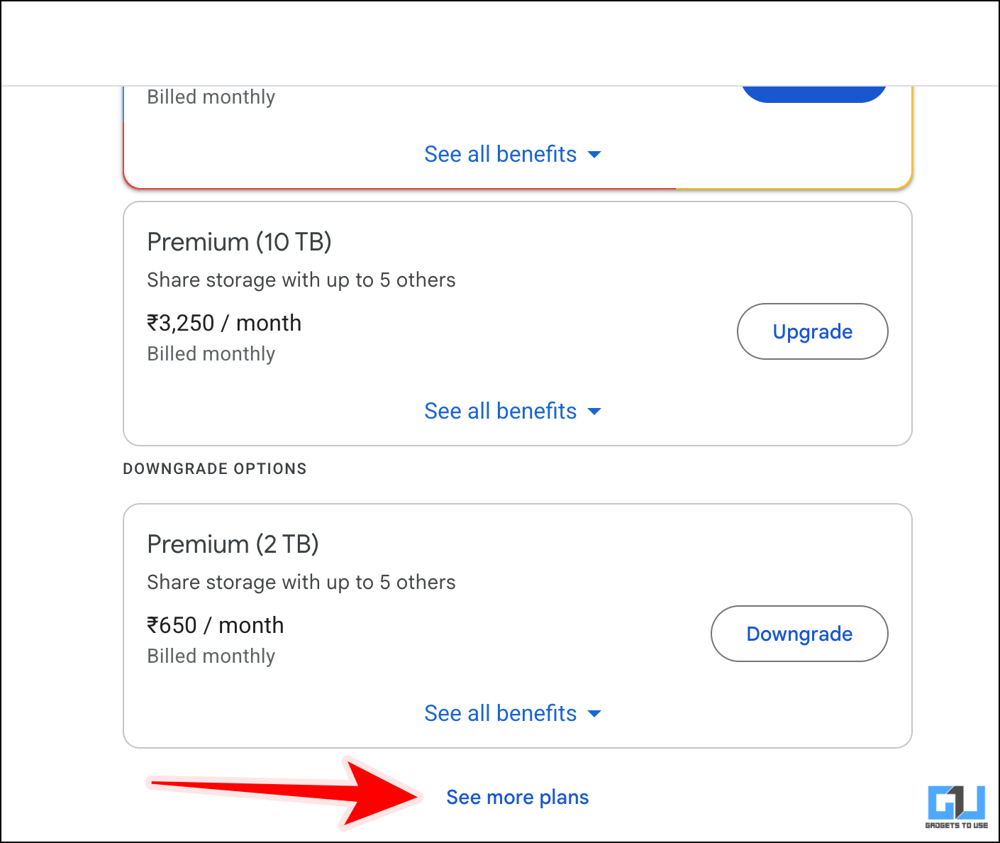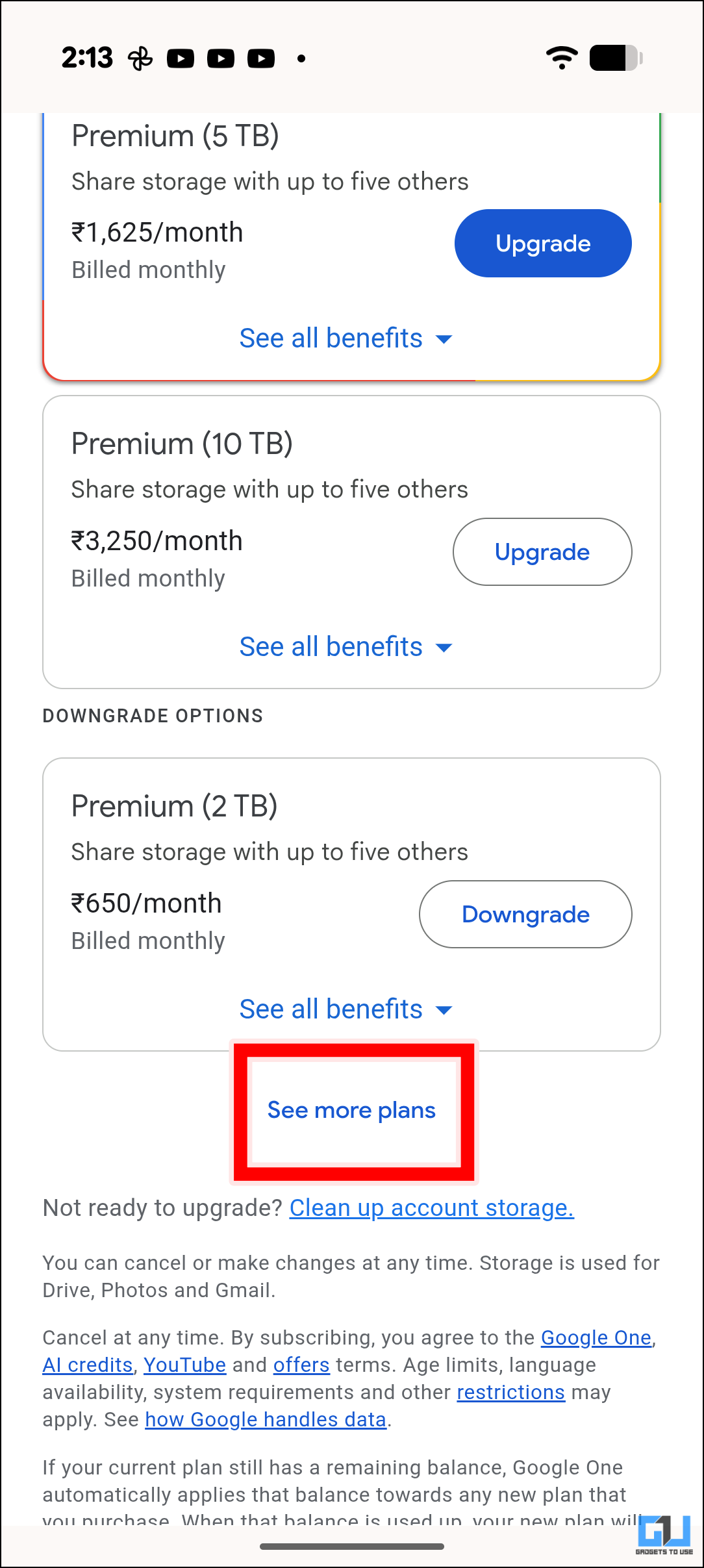 Upgrading your storage plan is extremely simple; the option is always available to you. However, if you wanna downgrade, you have to dig a little deeper. You can find the option on the Google One app’s homepage. Once you downgrade, the plan will come into effect from the next month, and you will receive an email stating the same. Furthermore, the storage plans with no AI privileges are stashed deep, and you can only see them if you choose to see all the plans. Google only recommends the plans containing AI privileges. So be smart and go through all the options first.