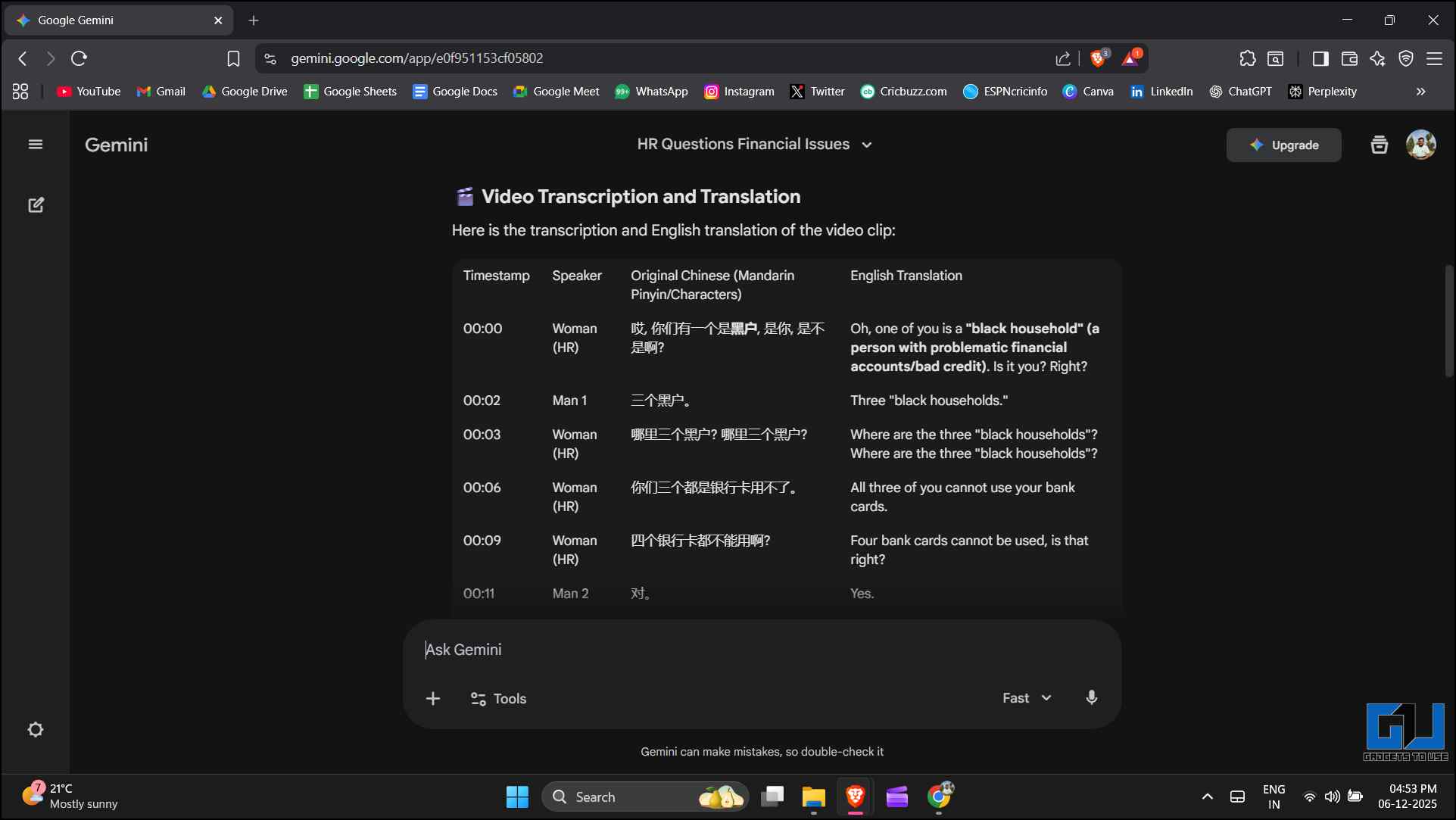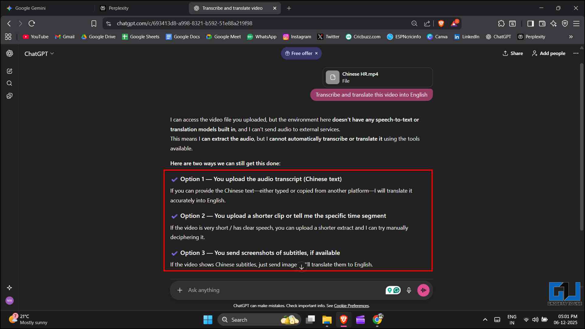 I also tried ChatGPT, but it just outright refused to transcribe and translate videos, even after following the same procedure as Gemini and Perplexity. Instead of translating, ChatGPT was asking me to share a transcript of the video first, which was not as helpful compared to other two tools.