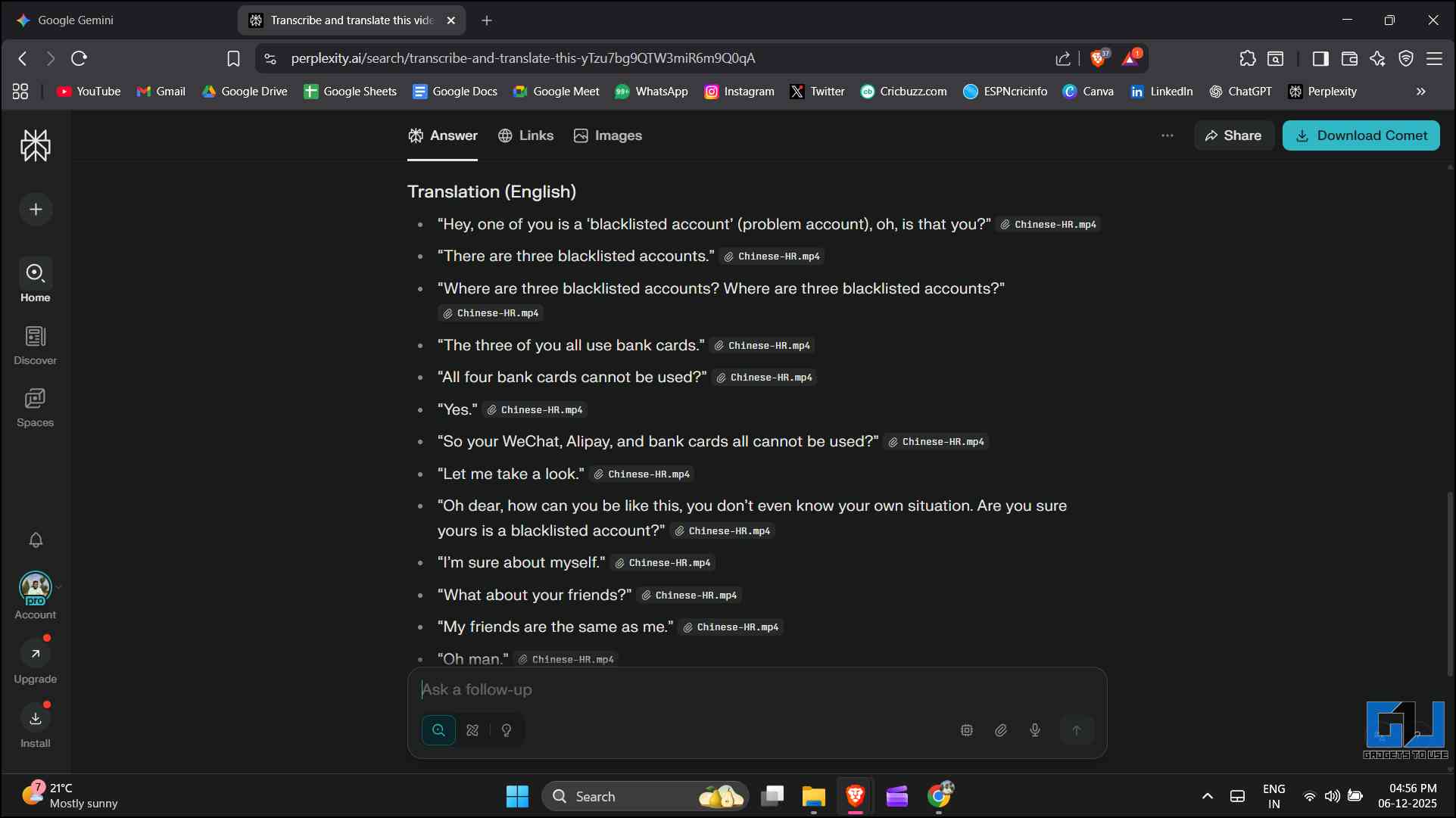 - I also tried ChatGPT, but it just outright refused to transcribe and translate videos, even after following the same procedure as Gemini and Perplexity.