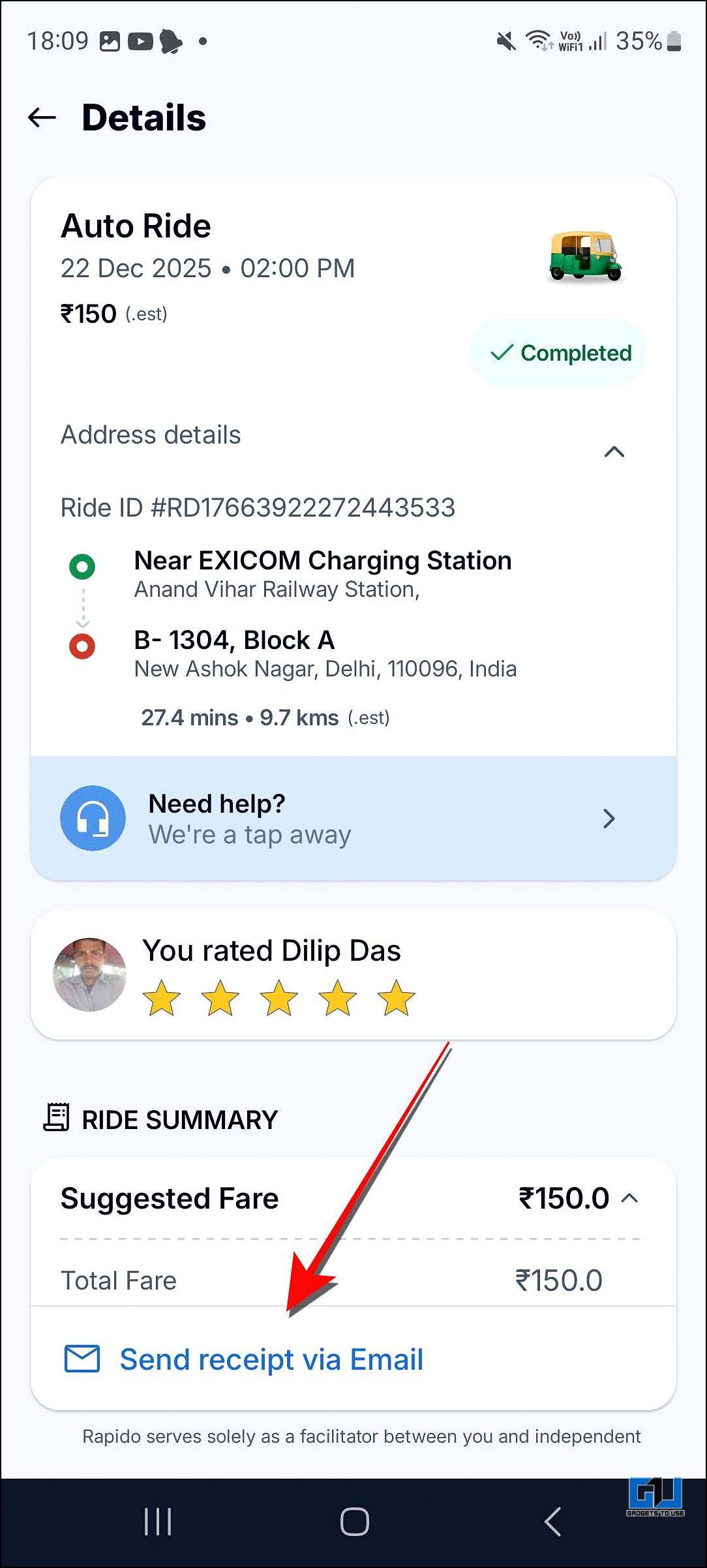 No. Rapido does not offer a “Download Invoice” button inside the app. but you can download it manually by following the above instructions.