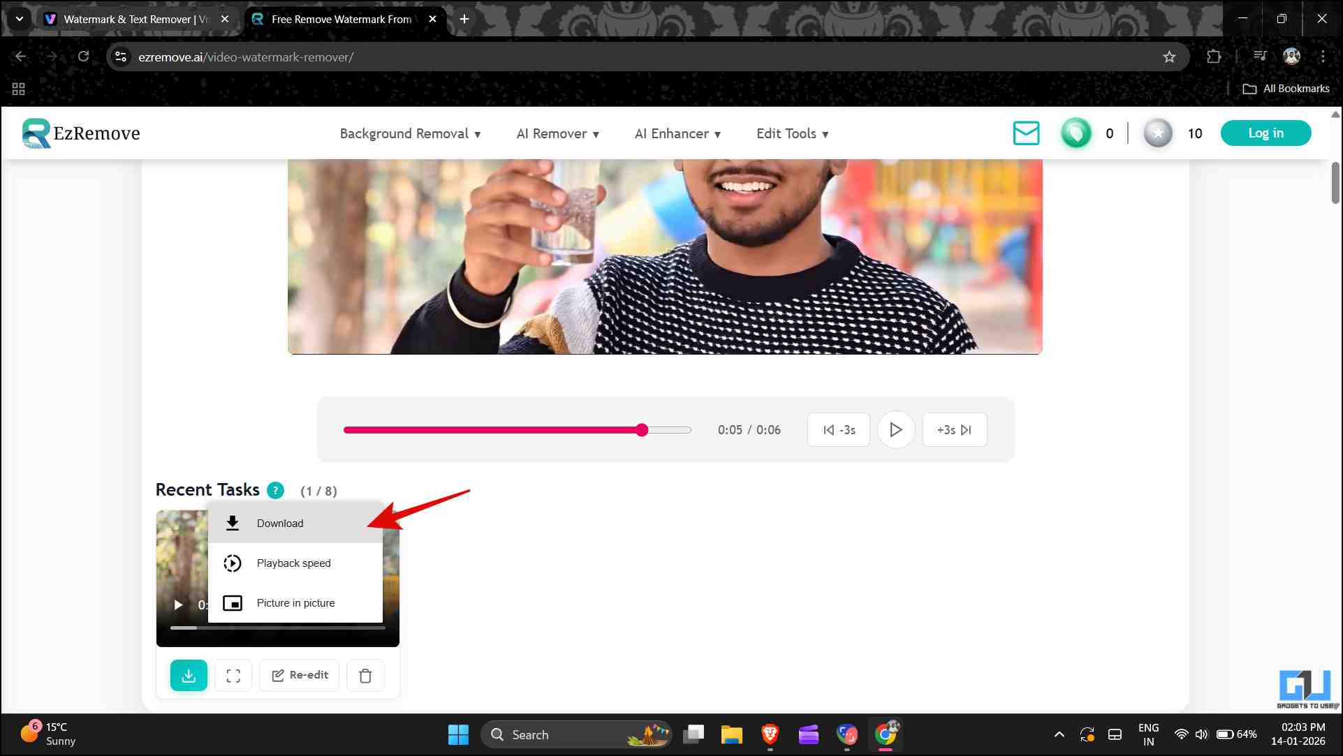 EzRemove lets you download longer videos, making it useful for short-form content. But this too has limited use, as you get 10 credits initially, and you can claim 10 more by logging in to the website. 1 credit converts to 2 seconds of video. There are more daily check-in rewards on the website that provide more credits, so you can explore them. If you consider using a tool like this once in a while, then it is a great option. For regular use, you would have to either buy credits or log in with different email IDs so you can use it for free.