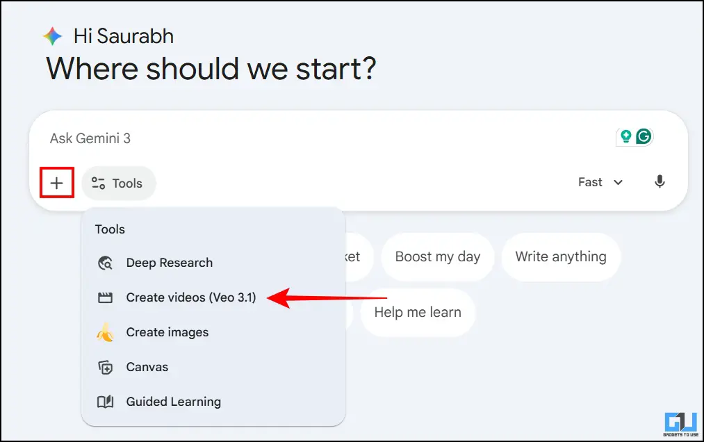 1. After opening a new chat in Gemini, select ‘Create Videos (Veo 3.1)’ from the tools menu and click on the plus icon to upload your image.