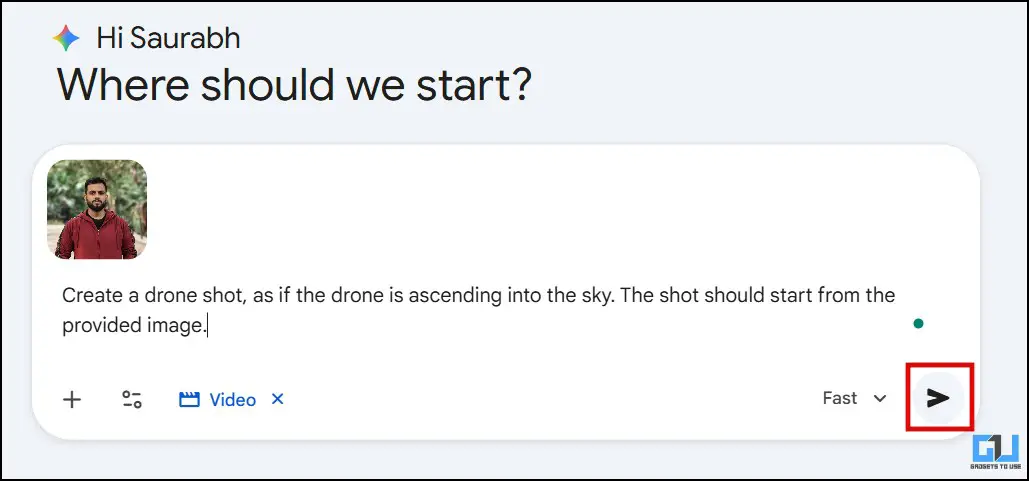 2. Now, enter the same prompt: “Create a drone shot, as if the drone is ascending into the sky. The shot should start from the provided image.” and hit send.